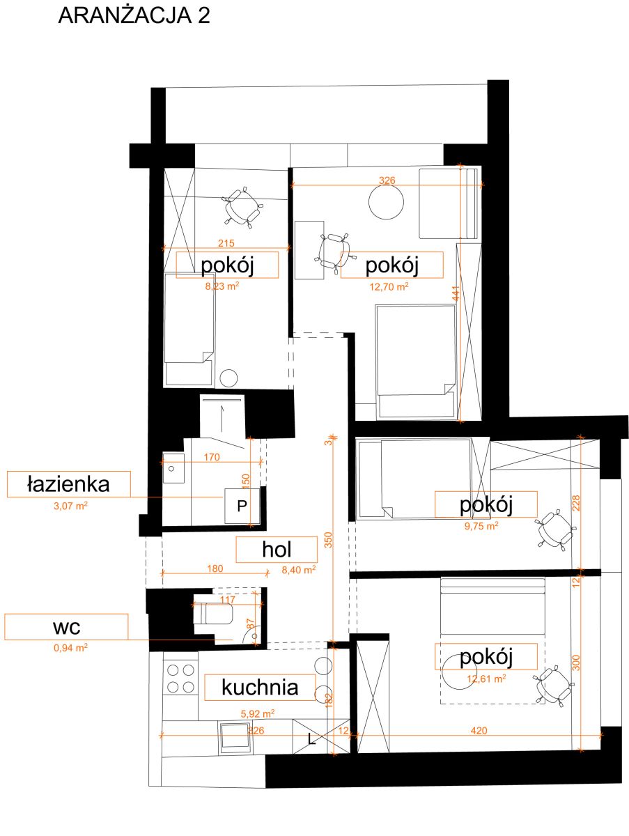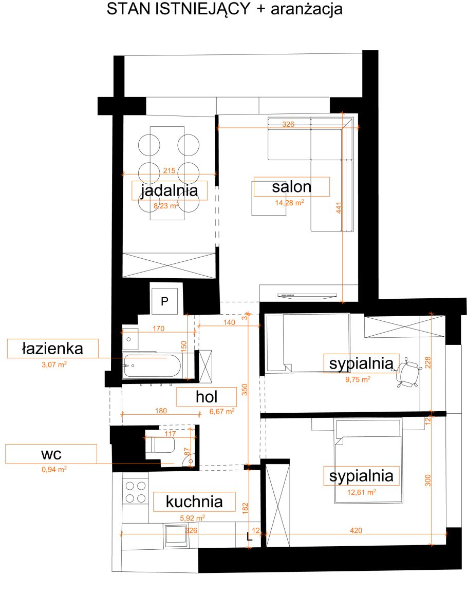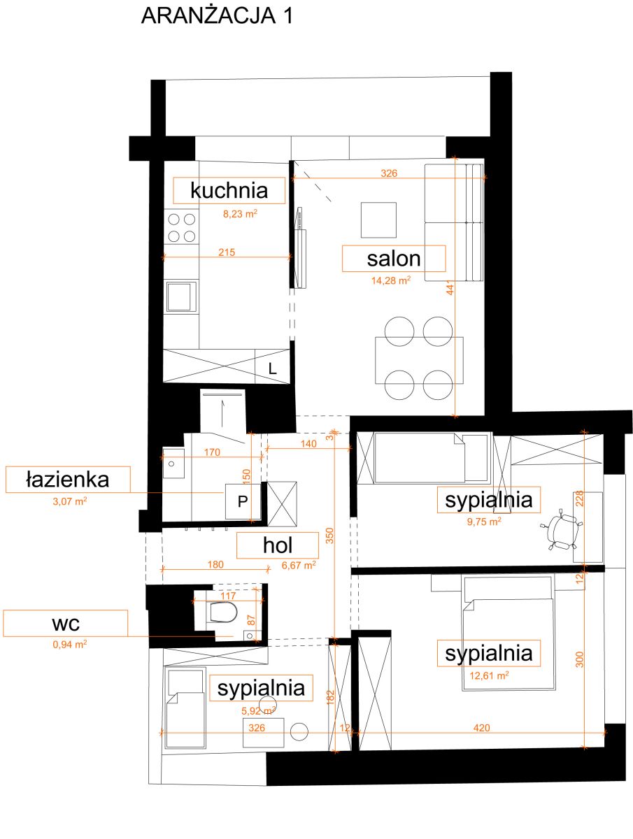 Do ogłoszenia załączamy aktualny plan mieszkania oraz przykładowe propozycje aranżacji.