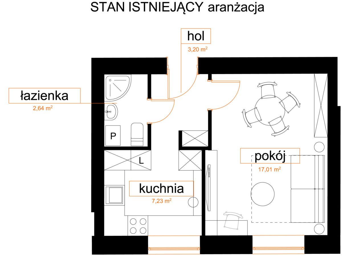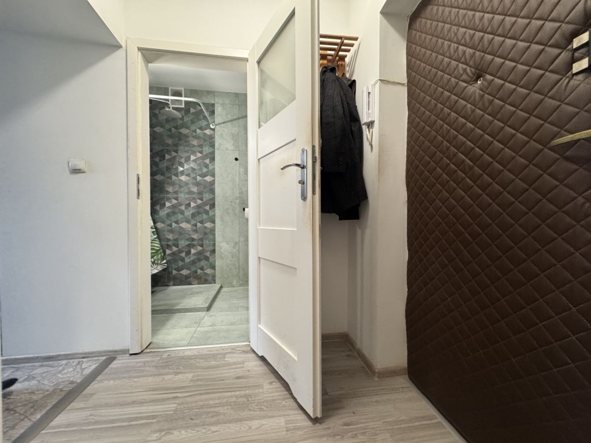 Mieszkanie aktualnie to 1-pokojowy lokal o funkcjonalnym rozkładzie: