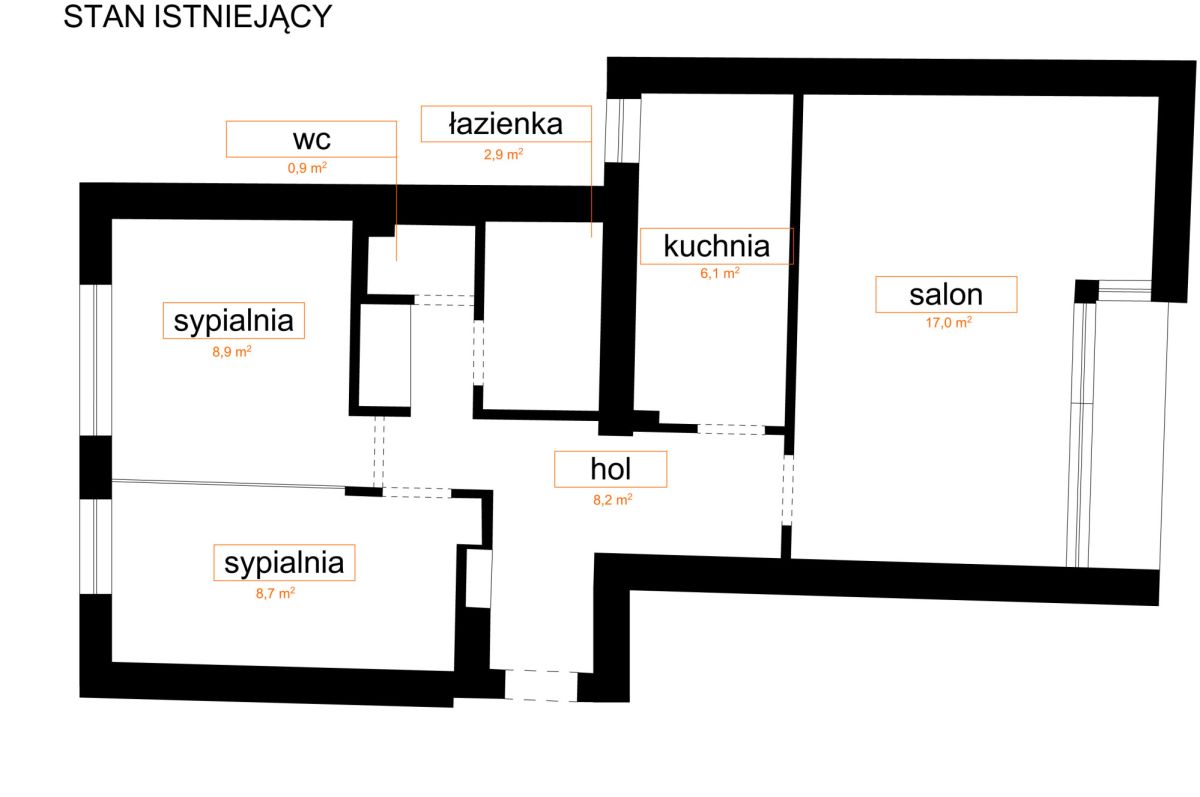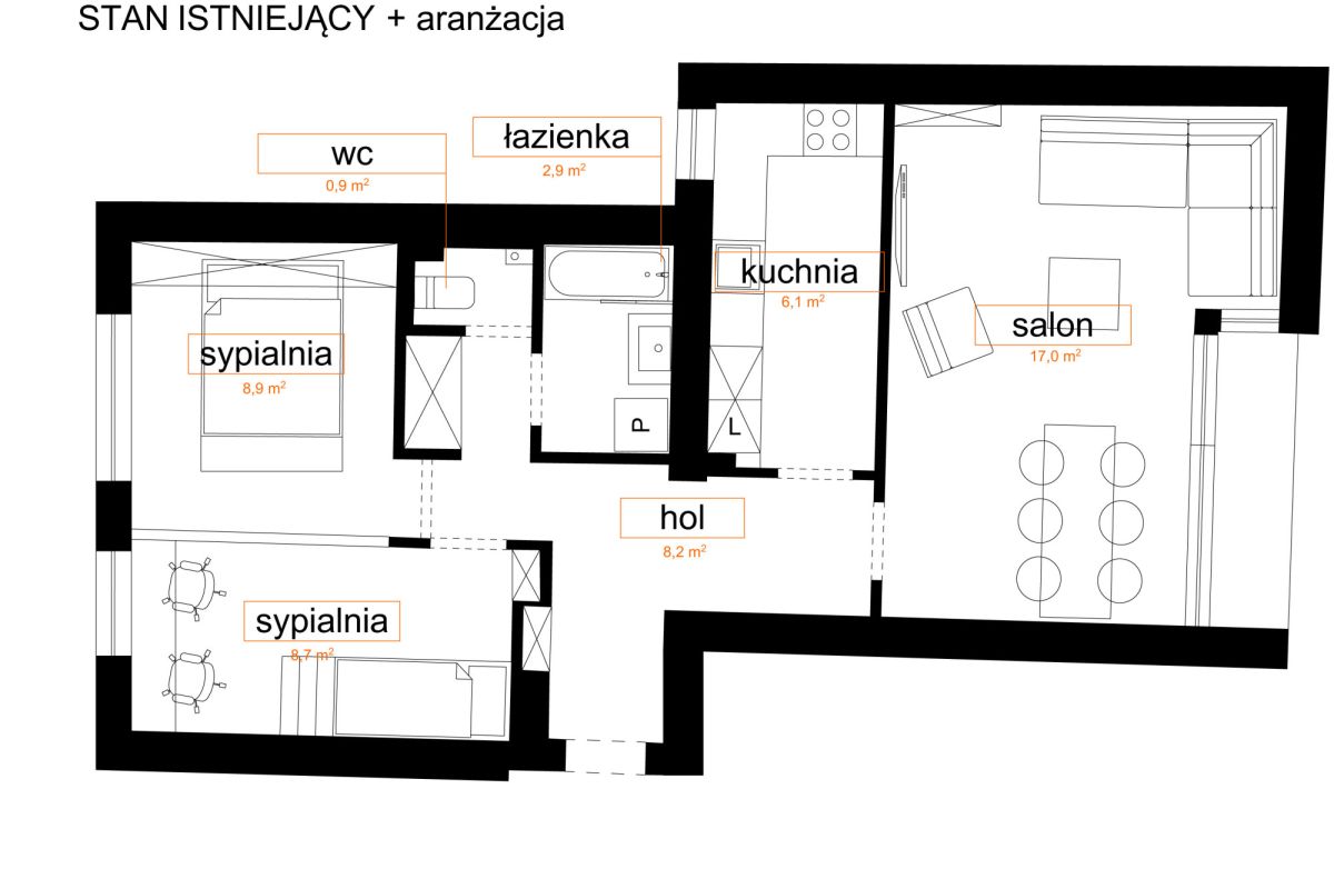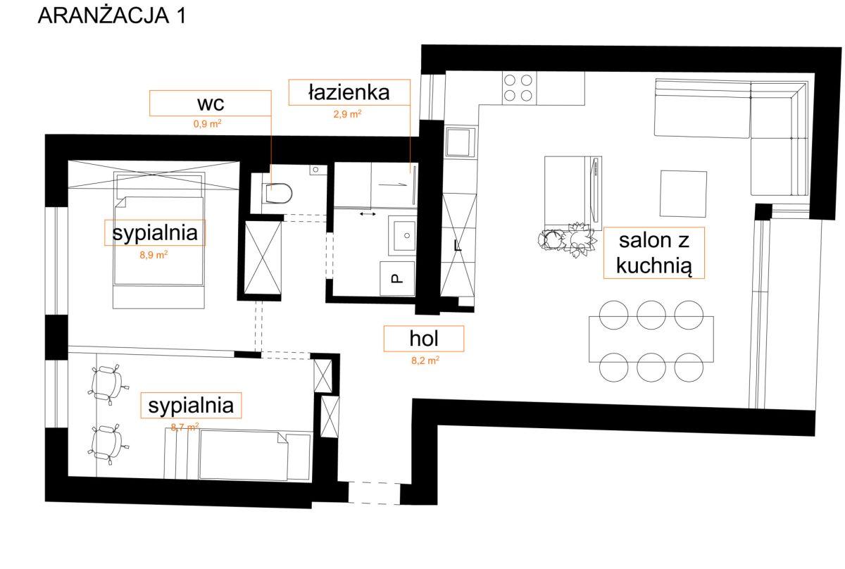 Do ogłoszenia załączamy aktualny plan mieszkania oraz przykładowe propozycje aranżacji.