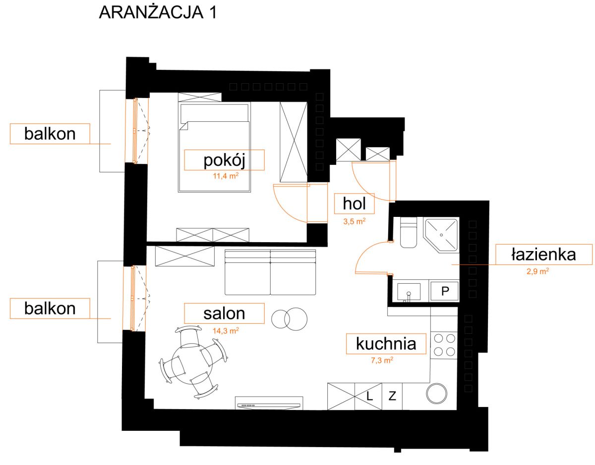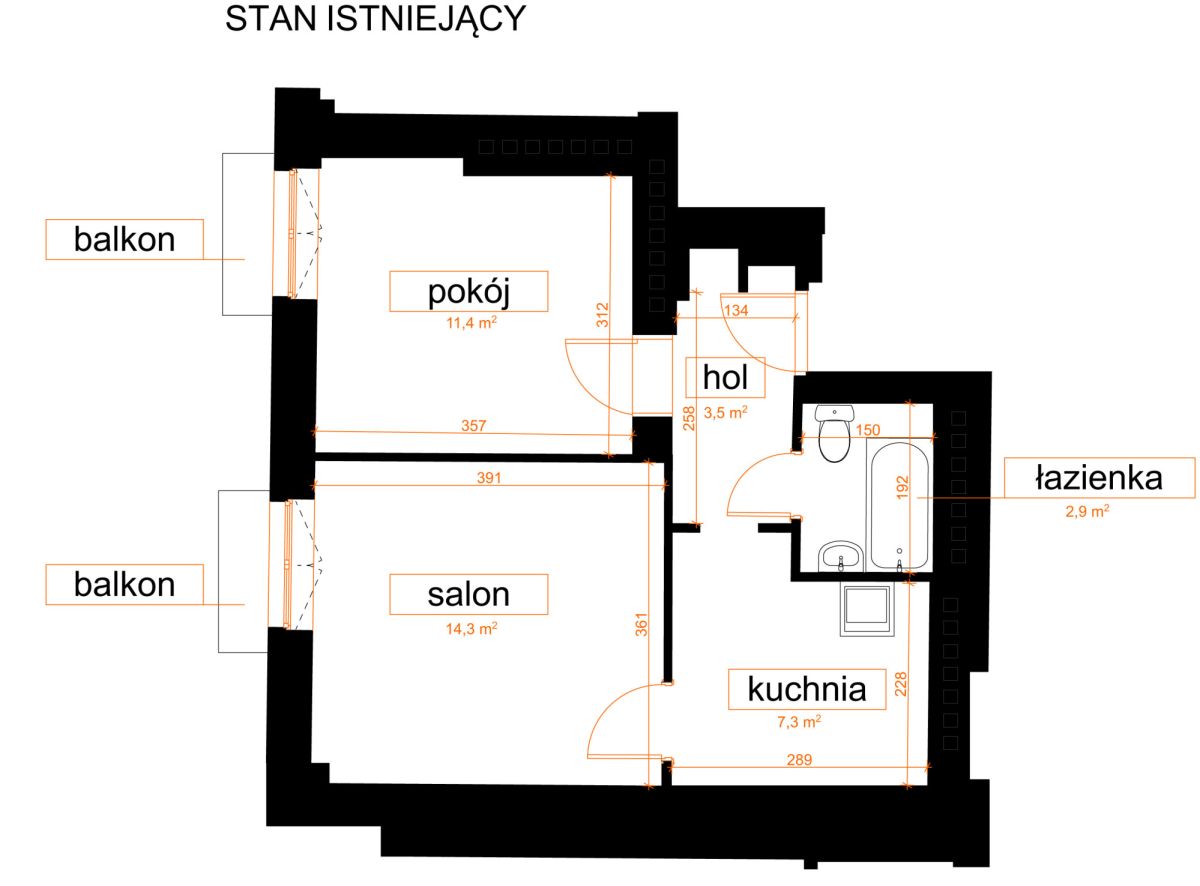 dwa oddzielne, ustawne pokoje - 14,3 m² i 11,4 m²