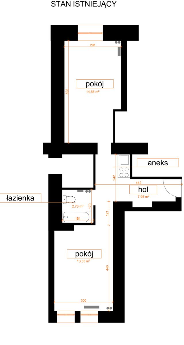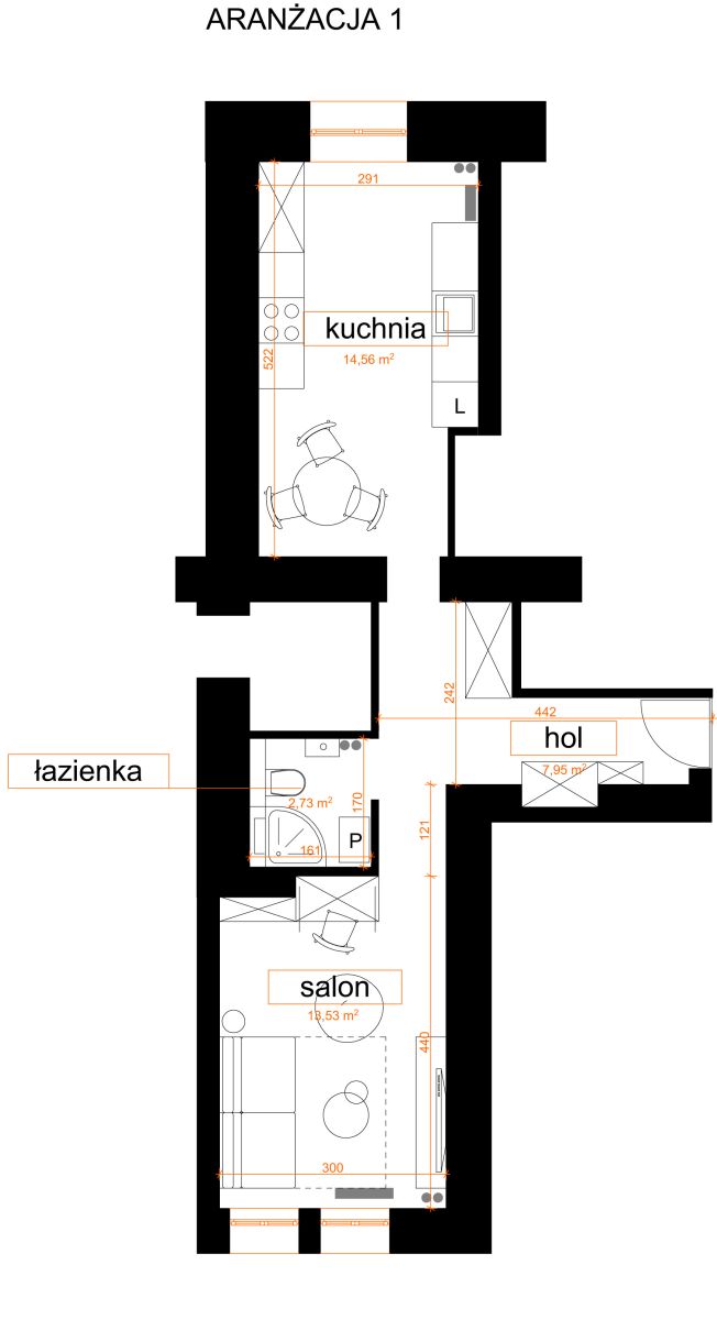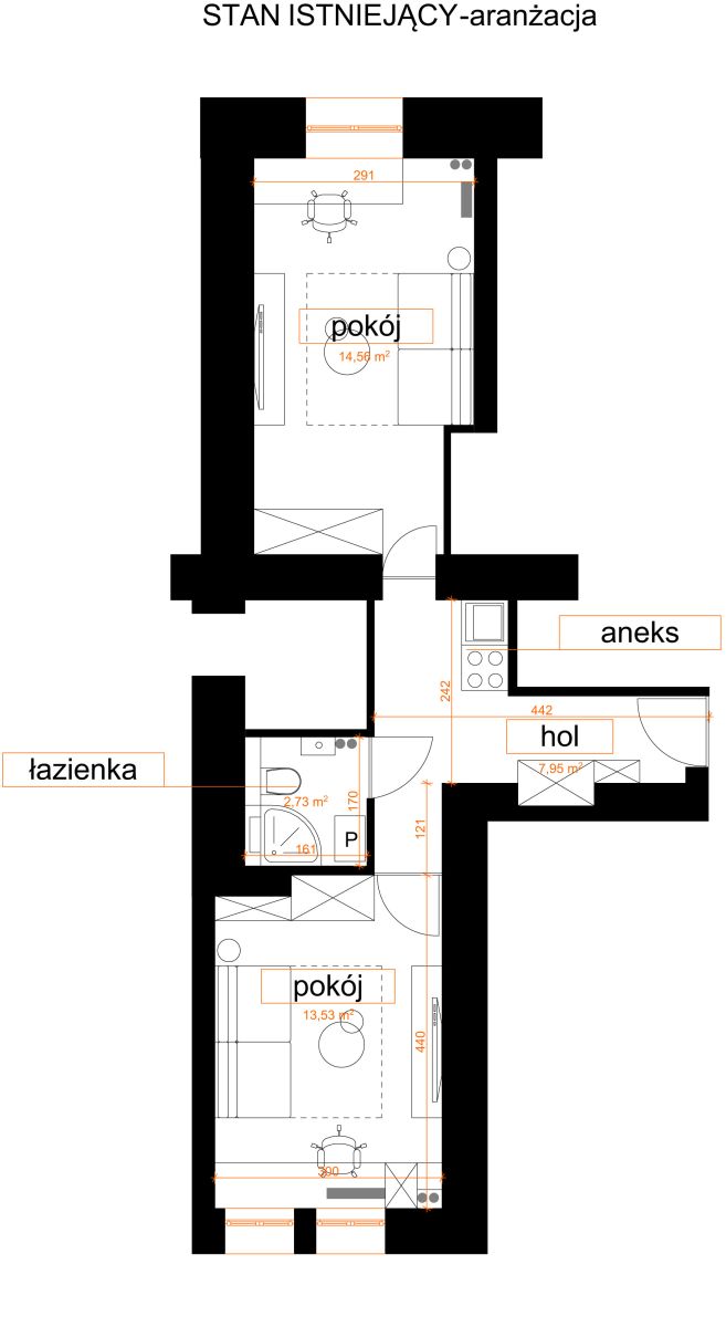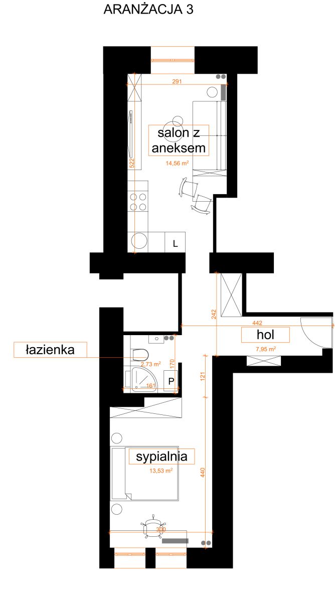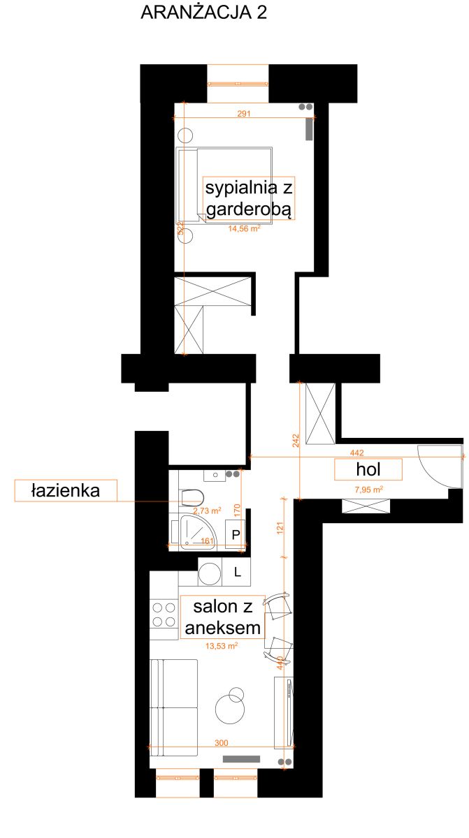 dwa oddzielnie zamykane pokoje, możliwość zmiany aranżacji na salon z kuchnią i sypialnią.